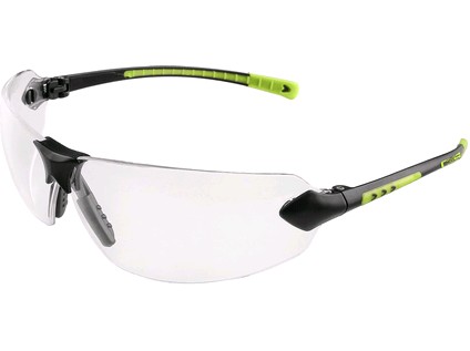 Polykarbonátové brýle se štíhlými pružnými postranicemi nezpůsobující tlak a možností nastavení úhlu zorníku. Vhodné pro použití s přilbou nebo maskou, při práci ve stavebnictví a skladech.