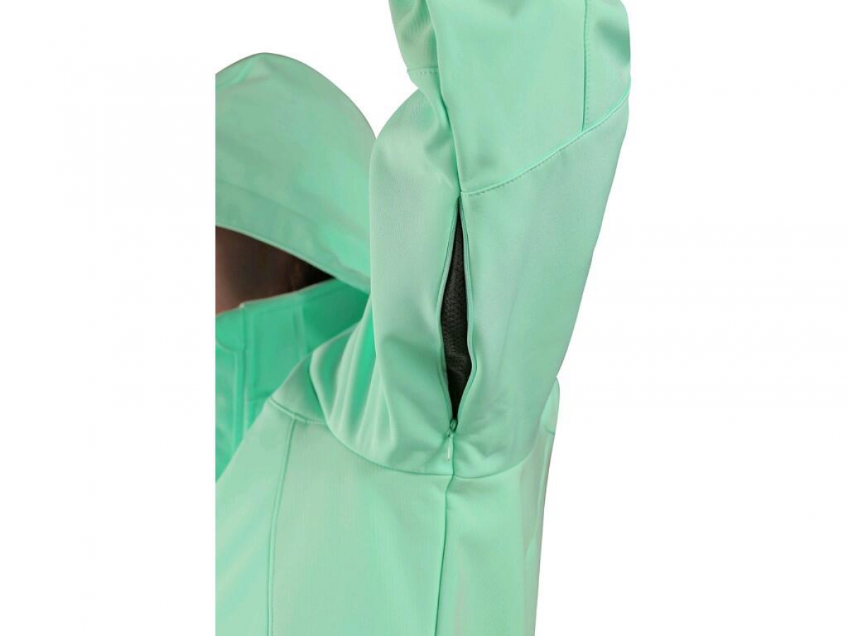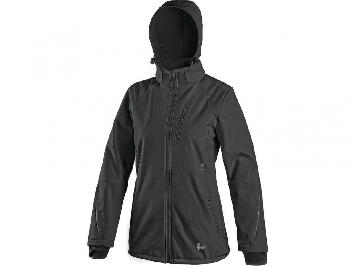Dámská softshellová bunda s odepínací kapucí, odolná proti vodě a větru, zapínaní na zip, větrání v podpaží, náprsní kapsa na zip, boční kapsy na zip, rukávy s vnitřními manžetami, stahování v dolním okraji, reflexní doplňky, TPU membrána. Odolnost materiálu proti průniku vody 5 000 mm mimo oblast švů, paropropustnost 5 000 g/m2/24h.