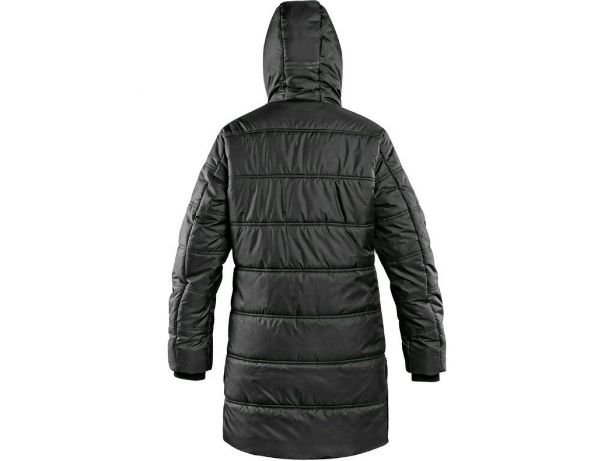 Dámský zateplený kabát s kapucí a bočním rozparkem na druky. Boční kapsy na zip, rukávy ukončeny pružnou manžetou, černé reflexní doplňky na kapuci, rozparku a podél hlavního zipu, vnitřní kapsa na zip.