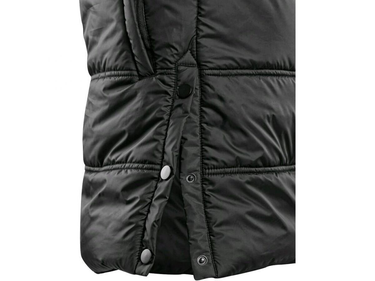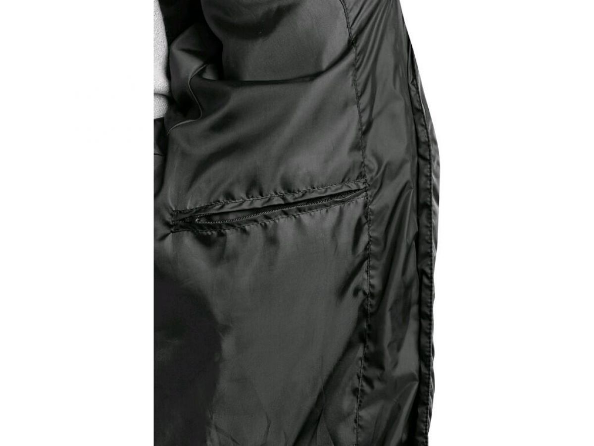 Dámský zateplený kabát s kapucí a bočním rozparkem na druky. Boční kapsy na zip, rukávy ukončeny pružnou manžetou, černé reflexní doplňky na kapuci, rozparku a podél hlavního zipu, vnitřní kapsa na zip.