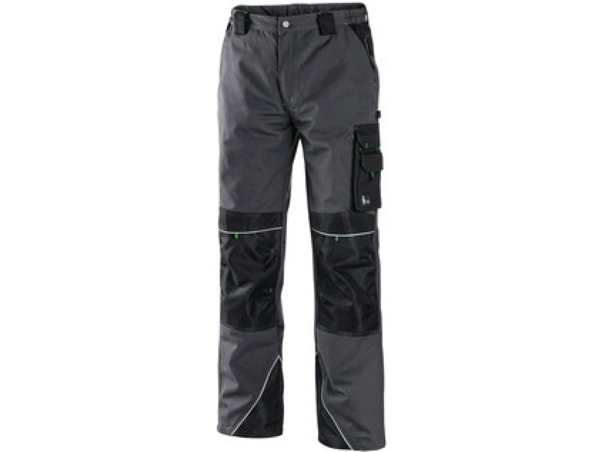 Pánské montérkové kalhoty, pas s poutky na opasek a gumou v bocích, přední klínové kapsy, multifunkční kapsy na obou stranách, kolena zesílena materiálem 600D polyesterem s možností vložení kolenních výztuh, dvě zadní kapsy s klopami, spodní část nohavic vyztužena materiálem 600D polyester, reflexní doplňky.