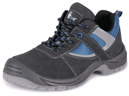 Bezpečnostní polobotka, perforovaná, s ocelovou špicí. Materiál: svršek z 1,4 - 1,6 mm kvalitní broušené kůže kombinovaný s prodyšnou tkaninou Cambridge, PU reflexní doplňky, prodyšná oděru odolná mesh podšívka, podešev: PU-TPU, protiskluzová, antistatická, olejivzdorná.
