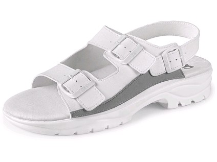 Pracovní sandál s nastavitelnými předními pásky a páskem kolem paty, podešev na klínku. Materiál: svršek z 2mm mikrovlákna, měkká, pohodlná stélka z vepřové kůže, podešev: jednohustotná PU, antistatická, protiskluzová.