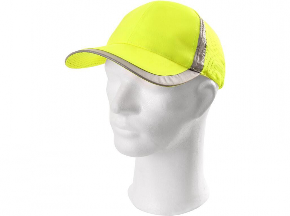 Čepice s kšiltem a s reflexními proužky, šestipanelová, zapínání na suchý zip, zadní díl ze síťoviny.