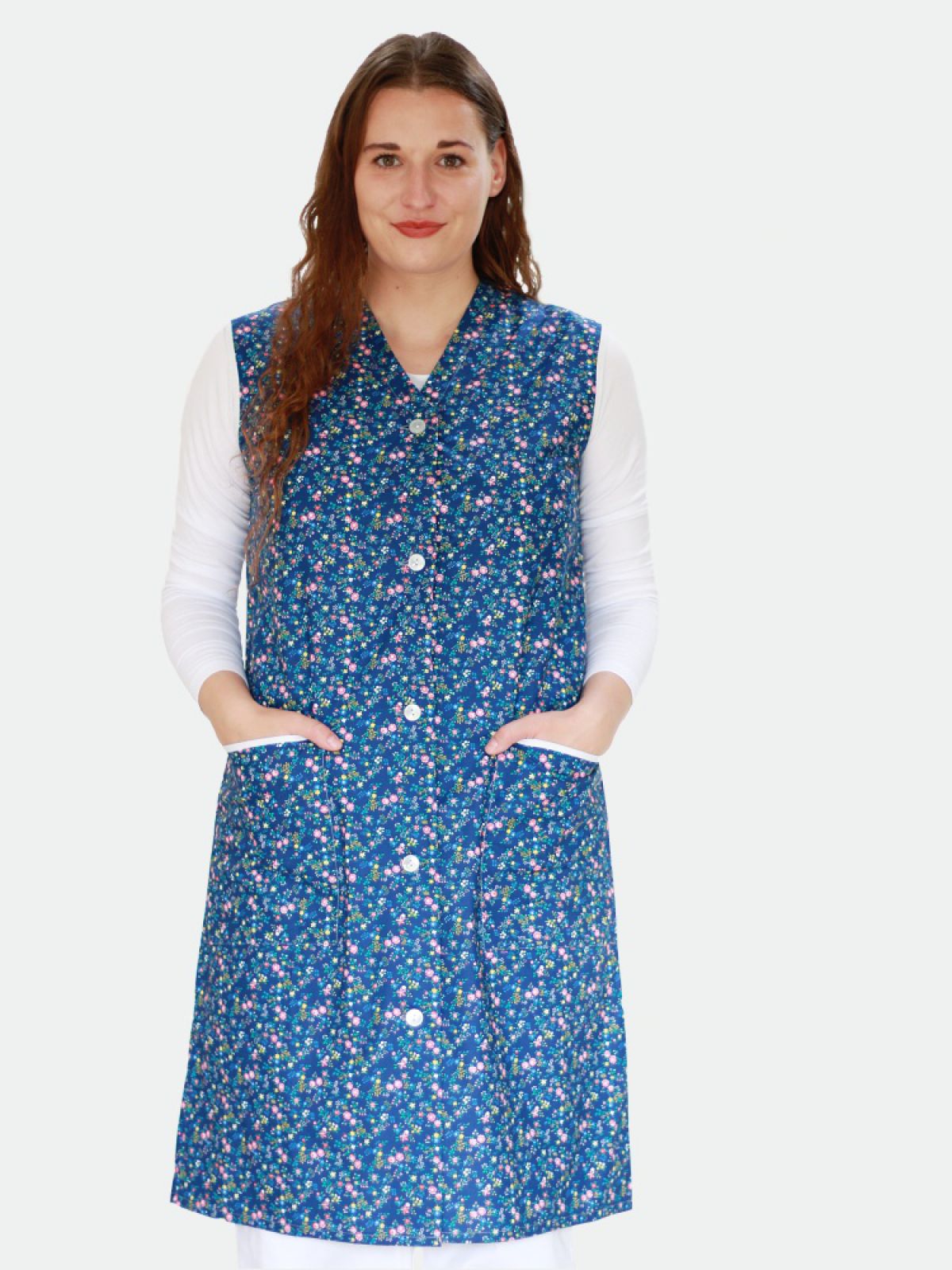 Šatová zástěra bez rukávů klasického střihu, zapínání na knoflíky. Na bocích jsou umístěny kapsy. Průramky a kapsy jsou zdobeny bílou paspulkou.